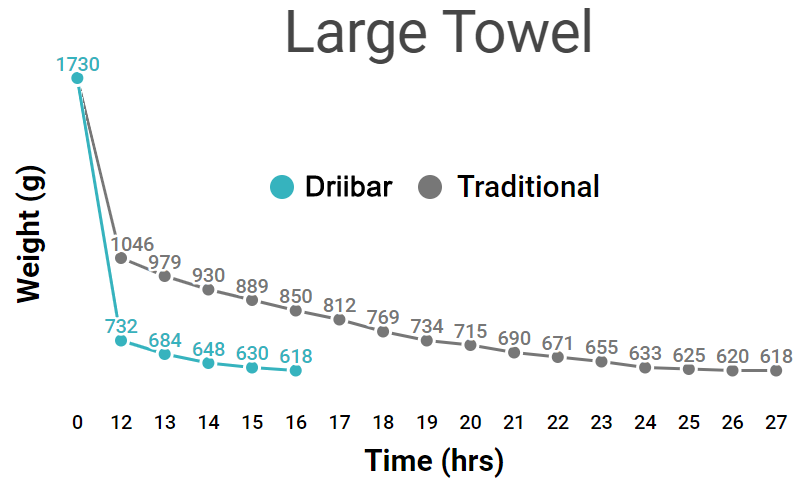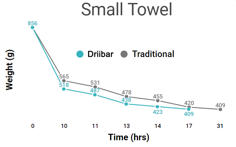 In both of the experiments, the towels hanging on the Driibar towel rod returned to their dry weights (409g, small towels and 618g, large towels) much sooner than the towel hanging on the traditional towel bar: 45% faster for the Small towel and 41% faster for the Large towel.